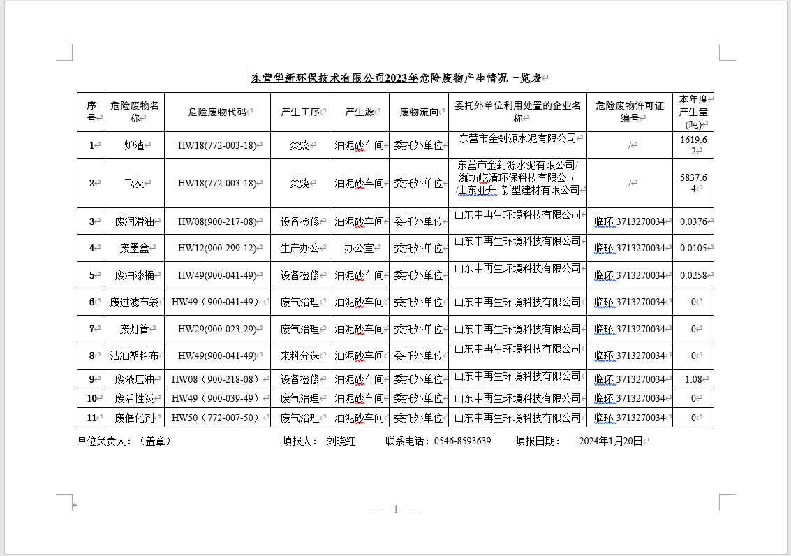 東營(yíng)華新環(huán)保固廢產(chǎn)生情況